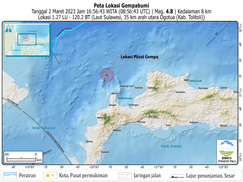 Sementara itu, titik lokasi gempa Tolitoli berada di Laut Sulawesi, 35 kilometer arah utara Ogotua.